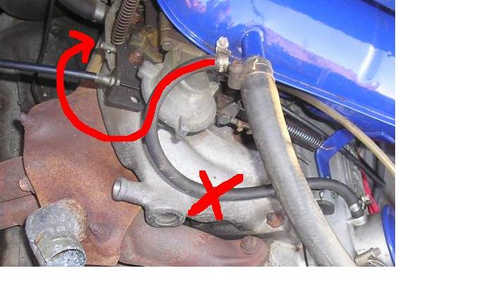 Podle mě to máš špatně zapojene Zapoj to podle te červené šipky do karbce a ve ventilovém víku, které je z fakana to zaslep a bude to v pohodě