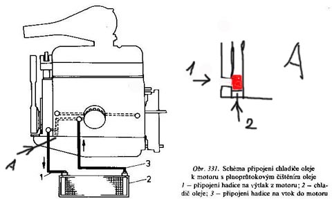 Sundáš vanu vyšroubíš zátku číslo 2 a našroubíš jinou tak aby ucpala díru číslo 1 tak ucpeš vlastně hlavní mazací kanál a všechen olej jde přes chladič a ne dírkou číslo 1