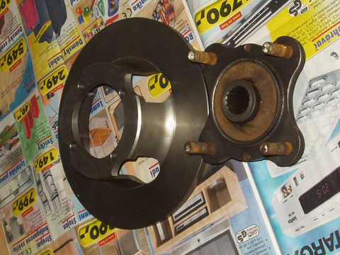 ty naboje musis ofrezovat jakoby na prumeru (v miste tech dvou zavitu M6) asi o 5mm (vychazi to na kraj toho zavitu, staci i min ale pak musis srazit hranu nebot to vadi v kotouci.. pak vezmes kotouc a do nej profrezujes ten ctyrlistek, staci udelat kriz frezou 45mm na prumer 158-160mm (vychazi to na kraj cinne plochy kotouce z pohledu kdyz to lezi na dosedaci plose) pak uz to jde do sebe nasadit.. pak jeste musis udelat nejakou roznaseci desku naktery bude drzet disk.. to je treba kotouc prumeru cca 160/80 se 4ma dirama na prumeru 130 prumeru 12,5 o sile aspon 6mm lepe tak 8mm, pak drzaky to je diky tomuhle systemu celkem slozitej frezarskej vyrobek viz dokument podvozek.pdf treba na mych strankach..
