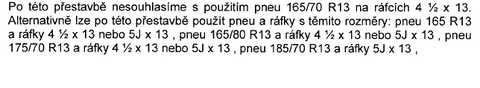 Jinak na šáde by s tim byl asi problém.Když jsem měl na Zlatce 185/70-13" tak mě jednou stavěli a byl problém.Přesto že jsem to měl ve velkym TP,tak policista tvrdil že to je nesmysl,že se tam takový gumy nedávali a že budu platit...Tak jsem mu řekl že platit nebudu,ať si napíše co chce ale prostě že to tam mam napsaný a nedam mu ani floka....Tak tam chvíli něco remcal a pak ať jedu že to bude jen domluvou a ať si ty kola sundam....Tůůůdle nůůůdle,nesundal jsem je když to tam je už z fabriky povolený....