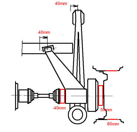 1. rozsirenie posunutim sikmeho a podelneho ramena o 4 cm von a medzi klbovy hriadel a hriadel kola vlozis distancnu vlozku 4cm. Bolo by treba prevarit usi na priecke prevodovky a posunut uchytenie podelneho ramena v kasni. (toto riesenie pouziva min. jedna skodula, videl som ju na nete, neviem kde, chalani urcite maju link)